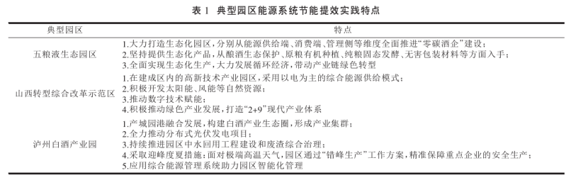 園區(qū)在推動我國實體經(jīng)濟發(fā)展和城鎮(zhèn)化發(fā)展中發(fā)揮了關(guān)鍵作用,是支撐制造強國戰(zhàn)略的主戰(zhàn)場。有研究表明,園區(qū)二氧化碳排放量約占全國總排放量的31%[4],園區(qū)是資源能源消耗最集中的地方。現(xiàn)階段,為了節(jié)約能源,保護(hù)環(huán)境,我國各級園區(qū)都在持續(xù)推動綠色低碳發(fā)展。田金平等研究指出我國工業(yè)園區(qū)節(jié)能提效實踐創(chuàng)新主要體現(xiàn)在以下5個方面: ①聚焦重點領(lǐng)域,全過程系統(tǒng)性推進(jìn)節(jié)能工作。②集中式能源基礎(chǔ)設(shè)施升級改造,多樣化開發(fā)利用余熱、 余壓和能量多級利用。③積極利用可再生能源,推進(jìn)能源結(jié)構(gòu)轉(zhuǎn)型升級。④積極開展智慧能源探索,實現(xiàn)能源全過程精細(xì)化管理。⑤建立健全能源管理體系。表1為典型園區(qū)能源系統(tǒng)節(jié)能提效實踐特點。