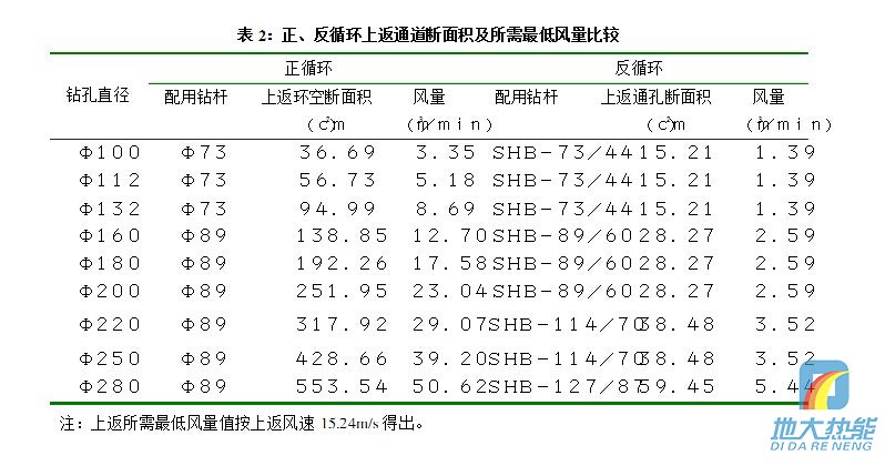 基巖水井通??趶綖棣?60~Φ280mm之間,該口徑硬巖的鉆進效率低,成本高,施工周期長,成為鉆探界亟待解決的難題。20世紀70年代開始,我國已引進潛孔錘技術應用于水井鉆鑿,鉆進效率數倍提高,展示了潛孔錘鉆進的良好前景。但水井工程,孔深大,背壓高,配套使用的空壓機不但風量要求大,風太也高,使鉆進成本大幅度增高。主要矛盾是滿足排渣屑上返風速的要求時,供風量巨大,遠超過了潛孔錘本身工作的需求。計算不同孔徑條件下滿足上返風速15m/s供風量的需求,見表1(Φ89鉆桿為例)。表1數據表明,孔徑越大,為滿足排渣屑要求而消耗的能量越大,經濟性越差。若實施反循環鉆井技術工藝,則排渣屑所需風量大大減小,如表2所示。